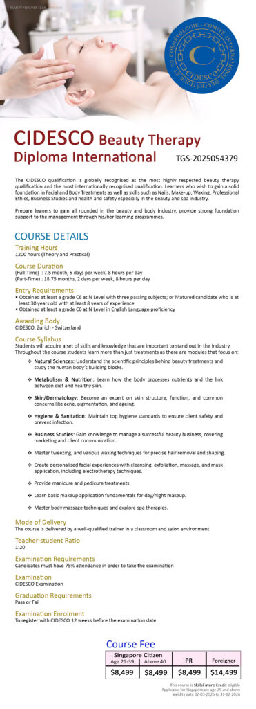 CPE Registration No. : 200908042N | Period of Registration : 26 April 2025 to 25 April 2027 © 2014. Beauty Forever Learning Hub. All rights reserved